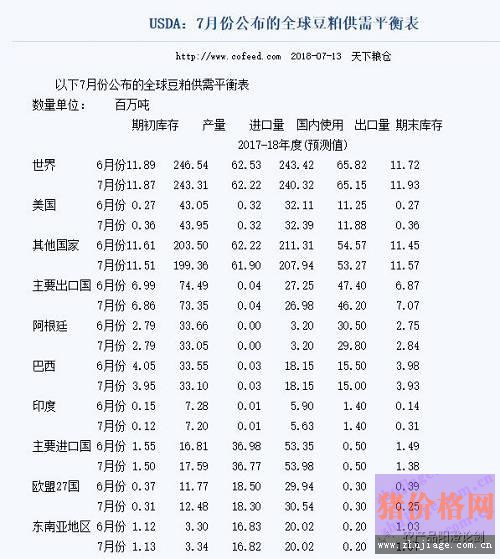 分析了目前豆粕價格的現(xiàn)狀,我們要從目前供需的角度去推演未來可能會發(fā)生什么變化。從USDA報告上來看,2017/18年度全球大豆產(chǎn)量較上一年度增加2000萬噸,USDA調(diào)高了我國2017/18年度大豆進口量600萬噸,總體使用量增加800萬噸,筆直認(rèn)為USDA對我國國內(nèi)需求判斷有誤。根據(jù)天下糧倉數(shù)據(jù)統(tǒng)計,2017年上半年我國大豆進口量4478萬噸,而2018年上半年大豆進口量4485萬噸,目前為止2018年大豆進口量與去年持平。今年大豆港口庫存一直處于高位,今年與同期相比庫存水平高出100萬噸左右,這說明2018年我們的豆粕市場需求是在走弱,而不是在增加,這是自2013年第一次出現(xiàn)豆粕需求有減弱的跡象。從供應(yīng)段的數(shù)據(jù)看,豆粕的需求比較差,我們從養(yǎng)殖端口來看,未來需求可能會發(fā)生什么樣的變化?