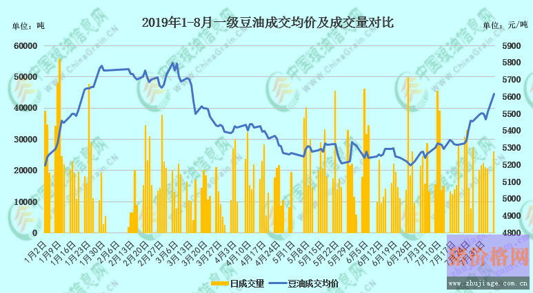 剛進入8月,由于中美貿(mào)易關系緊張加劇,國內(nèi)豆類油脂市場期現(xiàn)貨價格大幅走高,破位上行,以豆油為例,截至8月5日當天,國內(nèi)沿海主要廠商一級豆油現(xiàn)貨平均價格約5617元/噸,當日大連地區(qū)市場一級豆油主流報價在5550元/噸、天津地區(qū)5540元/噸、日照地區(qū)5550元/噸、廣州5660元/噸、北海5540元/噸左右。那么現(xiàn)階段外圍市場及消息面炒作將會對國內(nèi)豆類油脂市場帶來什么影響? 中國糧油信息網(wǎng)分析師辛顯明將對此進行簡要說明。