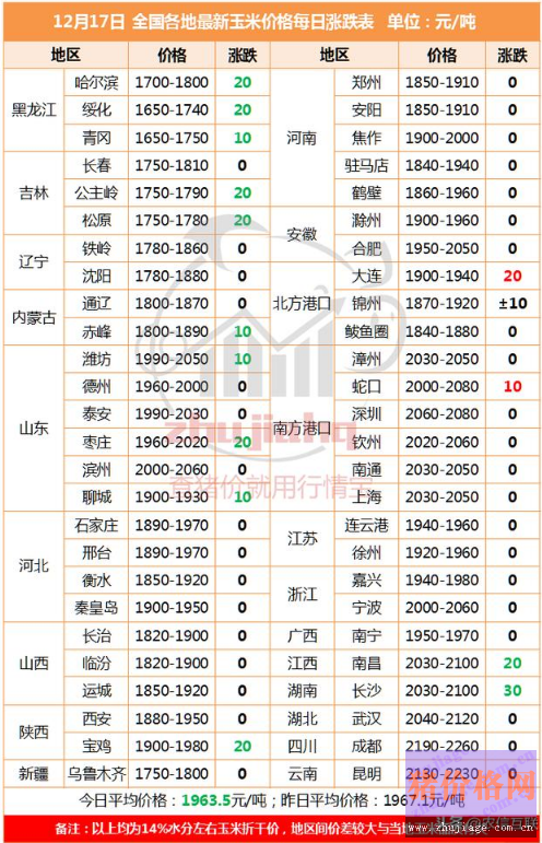 數(shù)據(jù)顯示:12月17日國內(nèi)玉米市場繼續(xù)穩(wěn)中偏弱運行,部分地區(qū)玉米價格繼續(xù)下跌10-30元/噸,港口局地陳玉米價格上調(diào)10-20元/噸。