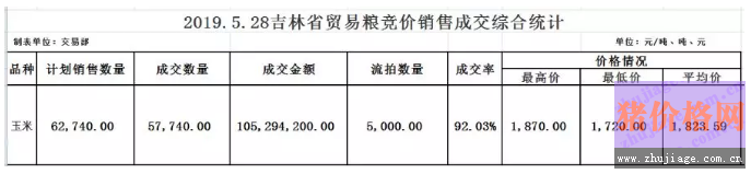 吉林省2019年5月28日貿(mào)易糧競價(jià)銷售交易結(jié)果:計(jì)劃銷售金額6.274萬噸,成交5.774萬噸,合計(jì)成交金額1.05億元,成交率92.03%,平均成交價(jià)1823.59元/噸。