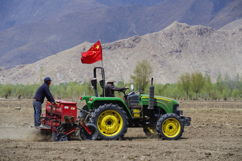 拉薩市曲水縣茶巴朗村的村民駕駛農(nóng)機(jī)在田間作業(yè)(4月24日攝)。
