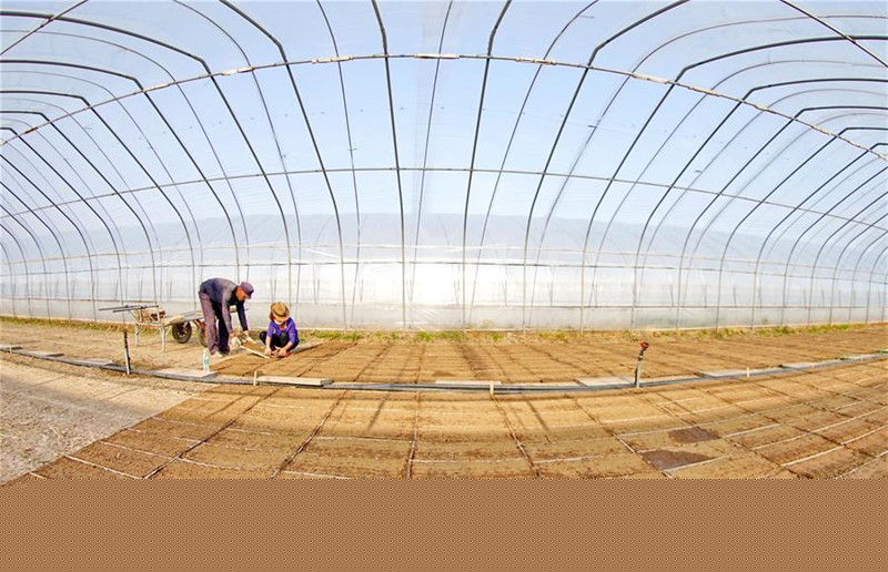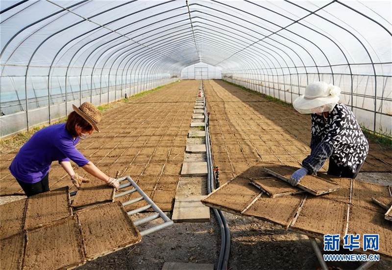 4月25日,唐山市海港經(jīng)濟開發(fā)區(qū)王灘鎮(zhèn)農(nóng)民在育秧棚內(nèi)碼放秧盤。