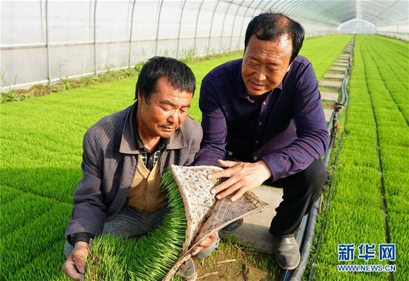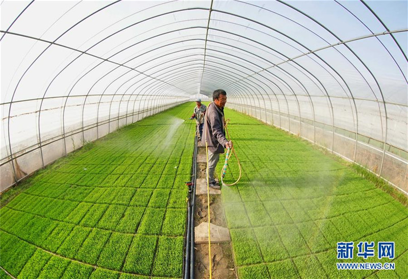 4月25日,唐山市海港經(jīng)濟開發(fā)區(qū)王灘鎮(zhèn)農(nóng)民在給秧苗噴灑殺菌劑。