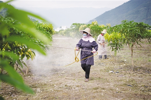 岜獨(dú)村農(nóng)民正在給蜜芒樹澆水。