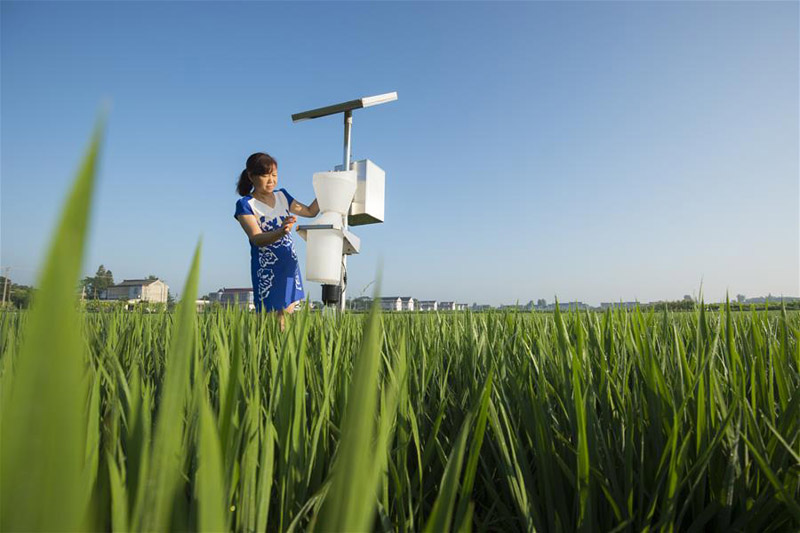 8月2日,在江蘇南通海安市城東鎮(zhèn)豐產(chǎn)村圣大家庭農(nóng)場(chǎng),工作人員在查看可誘捕害蟲、監(jiān)測(cè)害蟲情況的電子智能測(cè)報(bào)系統(tǒng)。