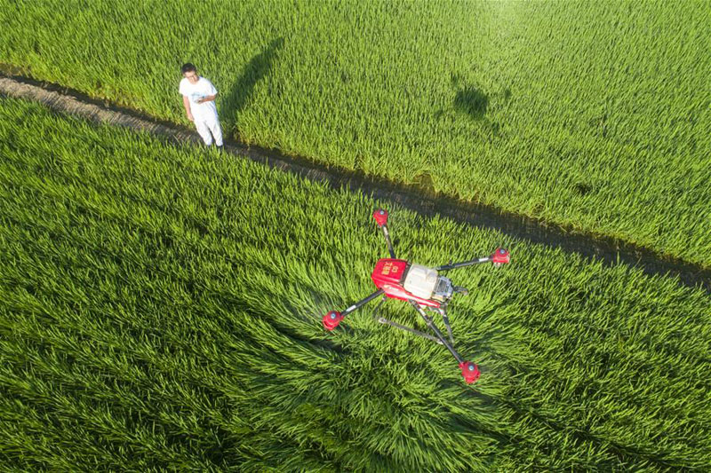 8月2日,在江蘇南通海安市城東鎮(zhèn)豐產(chǎn)村圣大家庭農(nóng)場(chǎng),工作人員使用無(wú)人機(jī)對(duì)稻田進(jìn)行管護(hù)(無(wú)人機(jī)拍攝)。