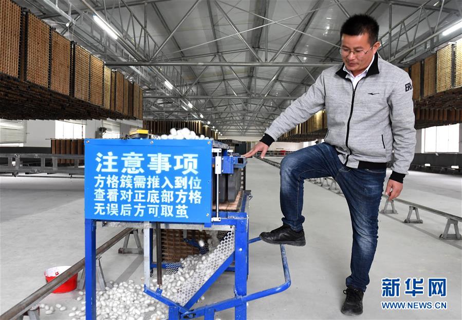 廣西河池市宜州區(qū)劉三姐桑蠶產(chǎn)業(yè)(核心)示范區(qū),工作人員在使用機(jī)械取繭(2017年12月8日攝)。