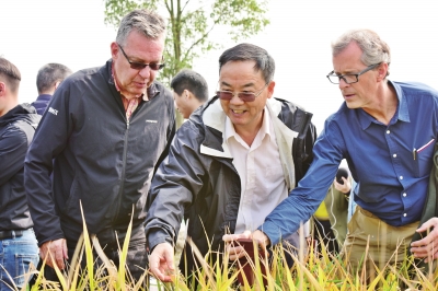 中國(guó)科學(xué)院院士、華中農(nóng)業(yè)大學(xué)教授張啟發(fā)(中)和國(guó)際專(zhuān)家在荊州市江陵縣考察再生稻