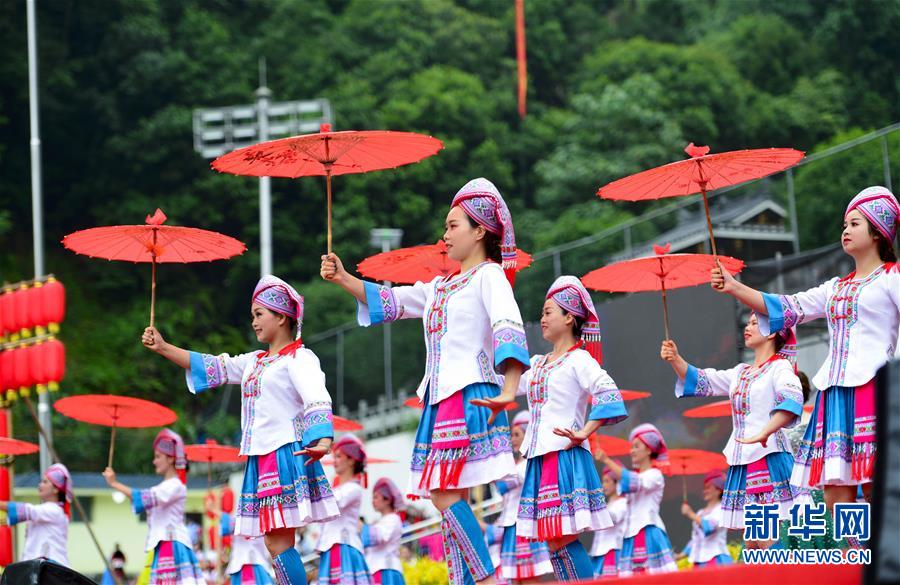 6月17日,演員在廣西龍勝各族自治縣龍脊梯田文化節(jié)上表演節(jié)目。新華社發(fā)(吳生斌 攝)