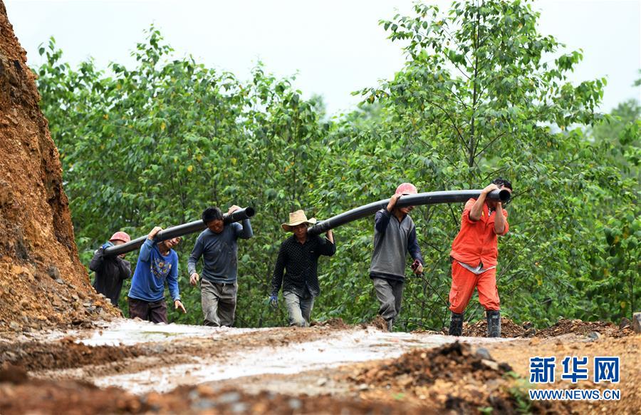 7月7日,農(nóng)民在貴州省普安縣地瓜鎮(zhèn)屯上村的“扶貧茶園”里搬運水管,準(zhǔn)備修建茶園噴灌系統(tǒng)。