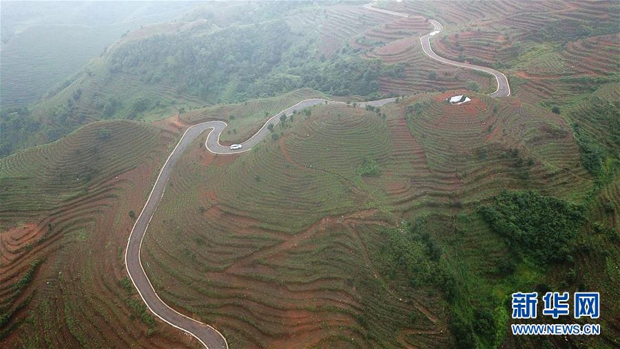 7月7日無人機(jī)拍攝的貴州省普安縣地瓜鎮(zhèn)屯上村的“扶貧茶園”。