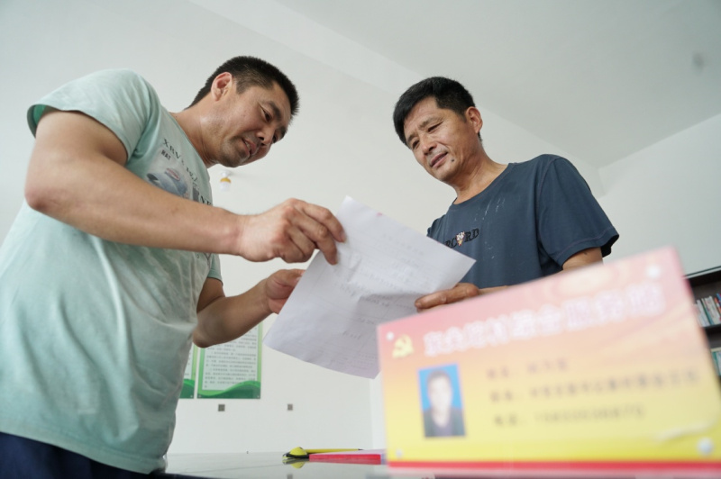 7月24日,村民(左)在河北省灤州市茨榆坨鎮(zhèn)東尖坨村綜合服務(wù)站內(nèi)辦理業(yè)務(wù)。