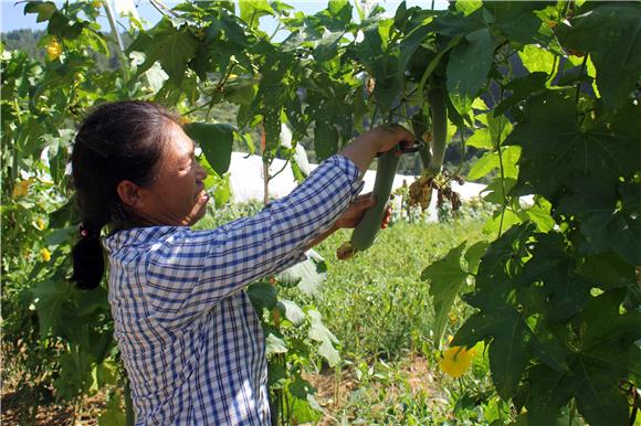 鎮(zhèn)南村聯(lián)勝生態(tài)農(nóng)業(yè)基地,村民在采摘絲瓜。通訊員 李亞軍 攝