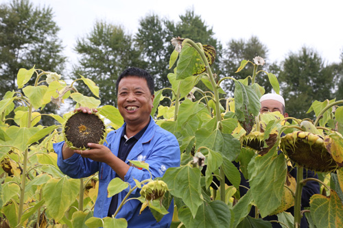 “城上村”扶貧第一書記劉貴明在油葵地和村民一起采摘油葵。
