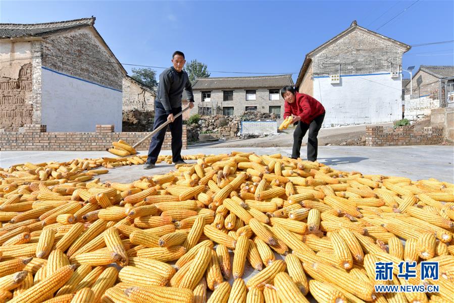 在奪火鄉(xiāng)高谷堆村,村民在晾曬玉米(10月13日攝)。