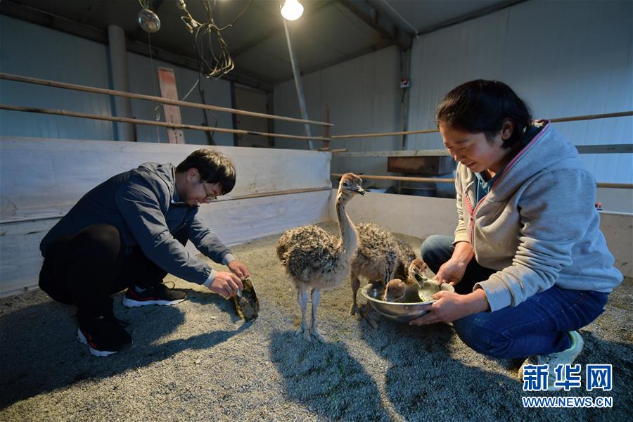 村民許俊鵬和妻子在照料小鴕鳥(niǎo)(10月14日攝)。2017年初,高谷堆村貧困戶許俊鵬一家在扶貧干部的幫助下開(kāi)始嘗試養(yǎng)殖鴕鳥(niǎo)創(chuàng)收。目前,許俊鵬一家已建成擁有20余只鴕鳥(niǎo)的養(yǎng)殖基地,平均年收入近4萬(wàn)元。