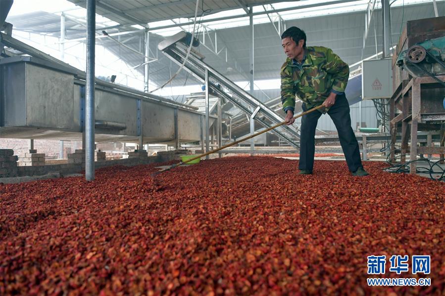 在奪火鄉(xiāng)高谷堆村,村民在晾曬山楂片(10月14日攝)。