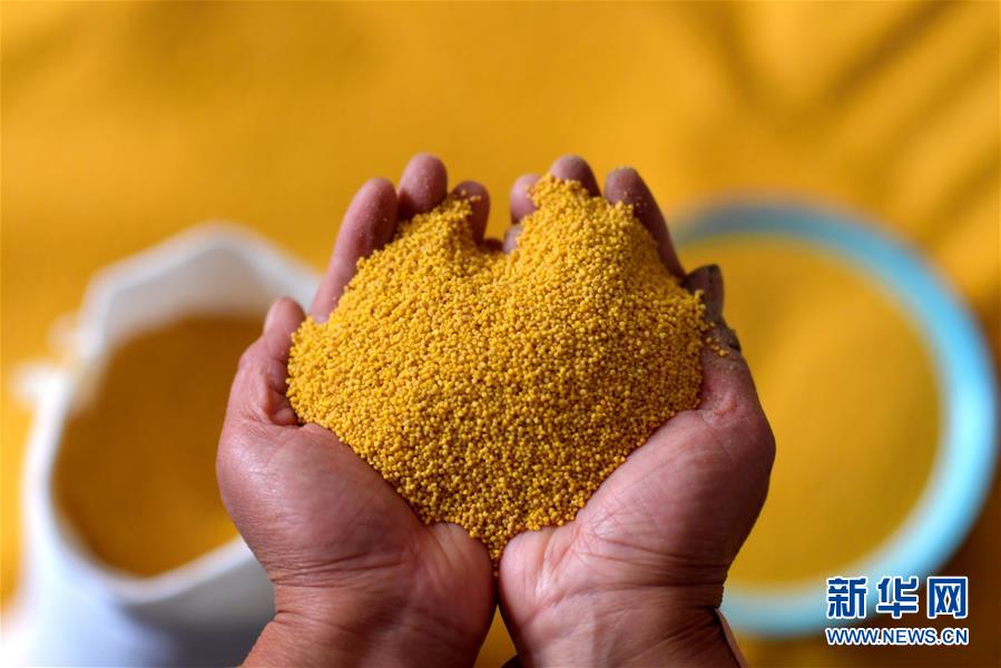 在奪火鄉(xiāng)高谷堆村,村民展示收獲的小米(10月14日攝)。
