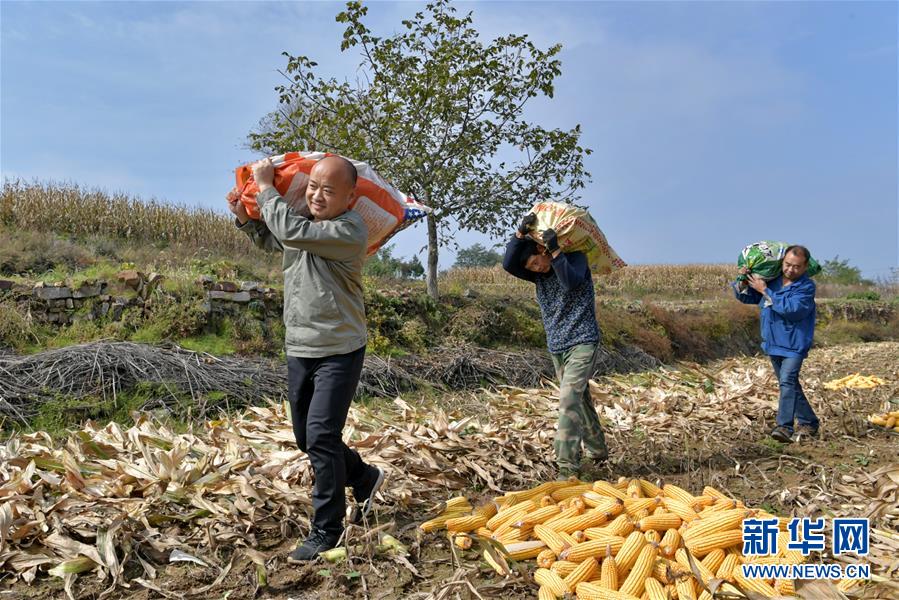 在奪火鄉(xiāng)高谷堆村,第一書記侯俊國(guó)(左)在幫助村民收玉米(10月13日攝)。