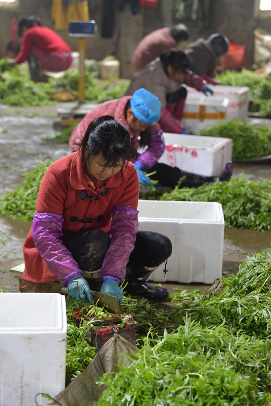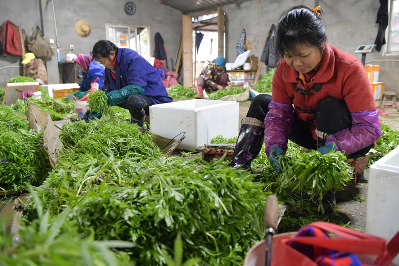 12月24日,在南昌縣幽蘭鎮(zhèn)竹林村藜蒿種植合作社內(nèi),當(dāng)?shù)剞r(nóng)戶在處理剛收割的藜蒿準(zhǔn)備裝箱外銷。