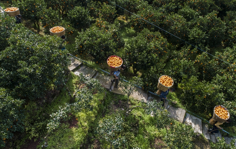 3月1日,秭歸縣水田壩鄉(xiāng)下壩村村民在田間轉(zhuǎn)運(yùn)臍橙(無(wú)人機(jī)照片)。