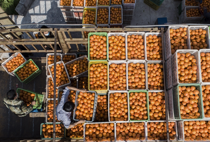3月1日,秭歸縣水田壩鄉(xiāng)下壩村村民將臍橙裝車(chē)。