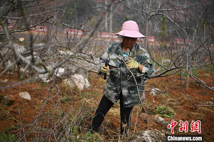 圖為3月17日,當(dāng)?shù)卮迕駰钯F興的妻子在蘋(píng)果田里勞作。中新社記者 劉冉陽(yáng) 攝