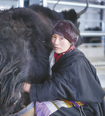 扶貧搬遷戶嘎色在擠牛奶,和布次仁一家一樣,如今她也搬到了牧場旁邊。