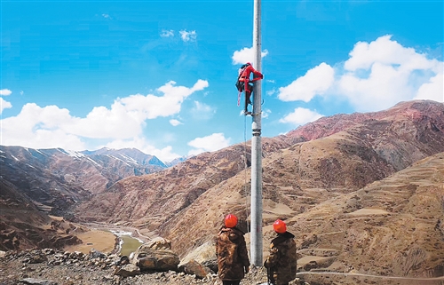 國家電網(wǎng)寧波供電公司援藏人員正在西藏那曲比如縣扎拉鄉(xiāng)電桿上安裝橫擔(dān)。杜亮亮攝(中經(jīng)視覺)