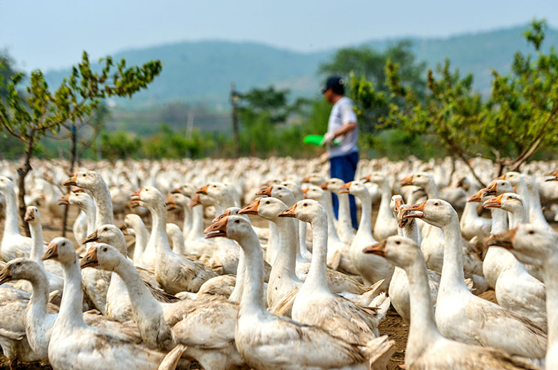5月3日,邯鄲市峰峰礦區(qū)彭城鎮(zhèn)藺家莊村村民給鵝群投喂飼料。