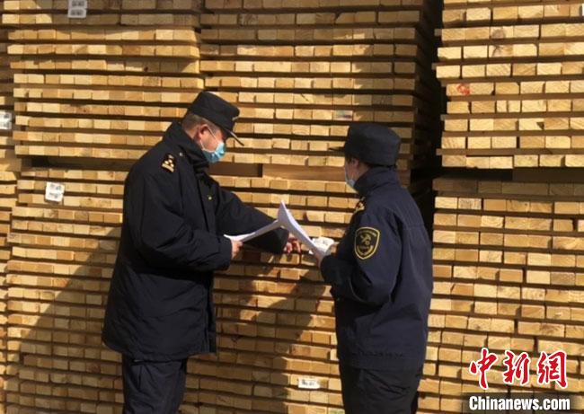 圖為蘭州海關(guān)工作人員監(jiān)管蘭州新區(qū)綜合保稅區(qū)木材加工企業(yè)!√m州海關(guān)供圖 攝