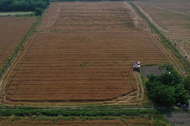 5月24日,農(nóng)戶駕駛收割機在浙江省湖州市吳興區(qū)八里店鎮(zhèn)尹家圩糧油植保農(nóng)機專業(yè)合作社的麥田里進行收割作業(yè)(無人機照片)。