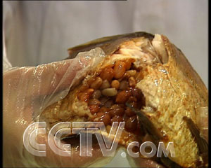 周德順:“這個(gè)魚打開,你看里面全是填進(jìn)去的花生米,這個(gè)刺都可以吃。