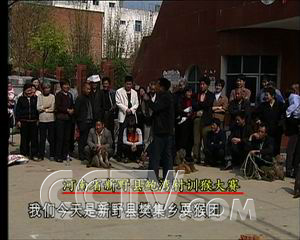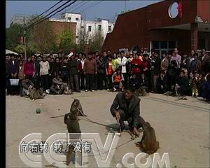 新野縣鮑灣村村民 張書雷:“各位來賓老少爺們兒們,我們今天是新野縣樊集鄉(xiāng)耍猴團,今天在這里聚會,趁著農(nóng)閑時間,我們要到外地演出,為咱們樊集鄉(xiāng)經(jīng)濟帶來騰飛,好,現(xiàn)在來個集體亮相,開始了。”