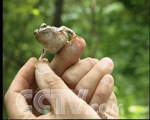 張朝亮:“這就是我們養(yǎng)殖的林蛙,這個林子里面要有幾十萬只,上百萬只這樣大小的蛙,它是每年的冬天入水了,然后春暖花開以后,它就從水里邊出來,就漫山遍野的跑,到森林里邊吃昆蟲,這是母蛙,它的前肢這個腿非常細(xì),特別是這個大拇手指頭這個地方?jīng)]有一個疙瘩,如果公蛙這有個一個疙瘩。”