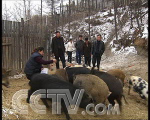 但因?yàn)橹晃拱,營(yíng)養(yǎng)單一,沒(méi)多久就發(fā)生了有的老母豬偷吃野豬崽兒的事。張海濱一方面增加一些維生素的投喂,一方面盡量還原野豬的自然習(xí)性,他把野豬輪流放到山林里放養(yǎng)。