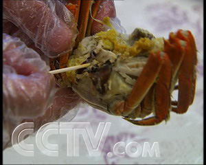 廚師:“這個螃蟹里面打開看,這個蓋子,在這個黃的下面,有一塊,就這一塊,這一塊是我們這邊,我們叫八角片,這一塊,它是大寒的東西,所以吃的時候一定要注意,這個不能吃。”