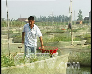 羅 旭初:“這個大網(wǎng)箱高度是1.5米,那個時候幾乎每年鱔魚都要發(fā)病,這個小網(wǎng)箱高度現(xiàn)在只有一米高了,好處在哪里呢,就是一米高的時候,網(wǎng)箱底沒有拖底, 像以前的那個,殘渣和泥底交接在一起,產(chǎn)生了臭味,氨氮偏高,鱔魚吃食降低,發(fā)病率也比較高,像我們現(xiàn)在底下是通的,換水是徹底流通的,網(wǎng)箱里面水也是新 鮮的,不像以前那么臭了,給它造成良好的環(huán)境。”