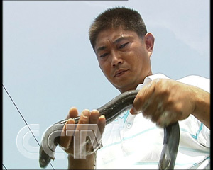 鱔魚經(jīng)銷商張烈成 :“這個大鱔魚賣15元。”